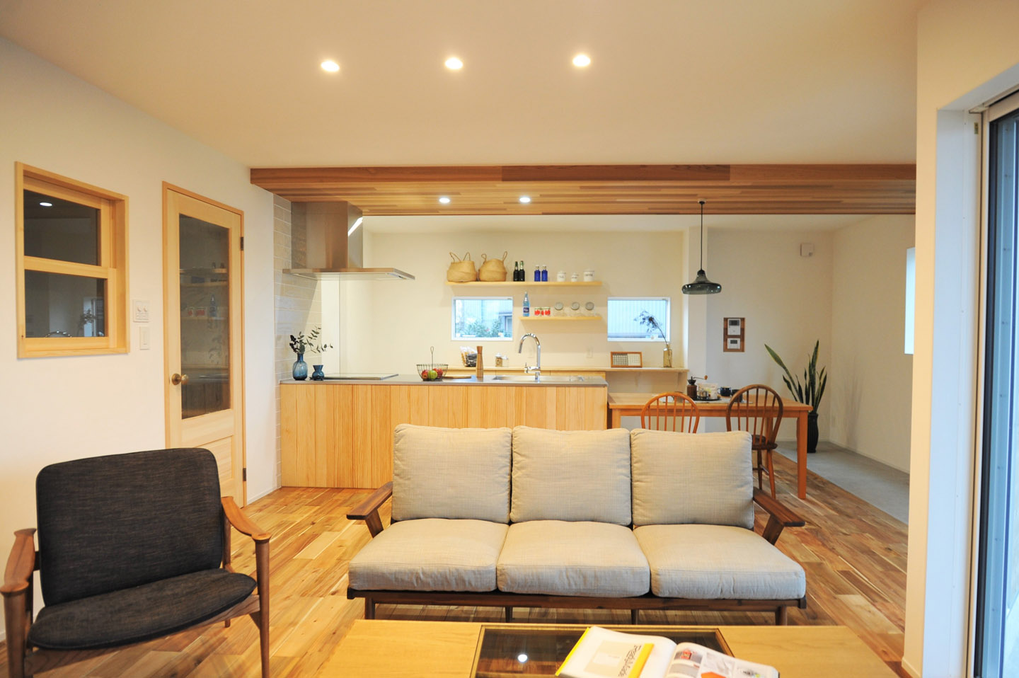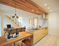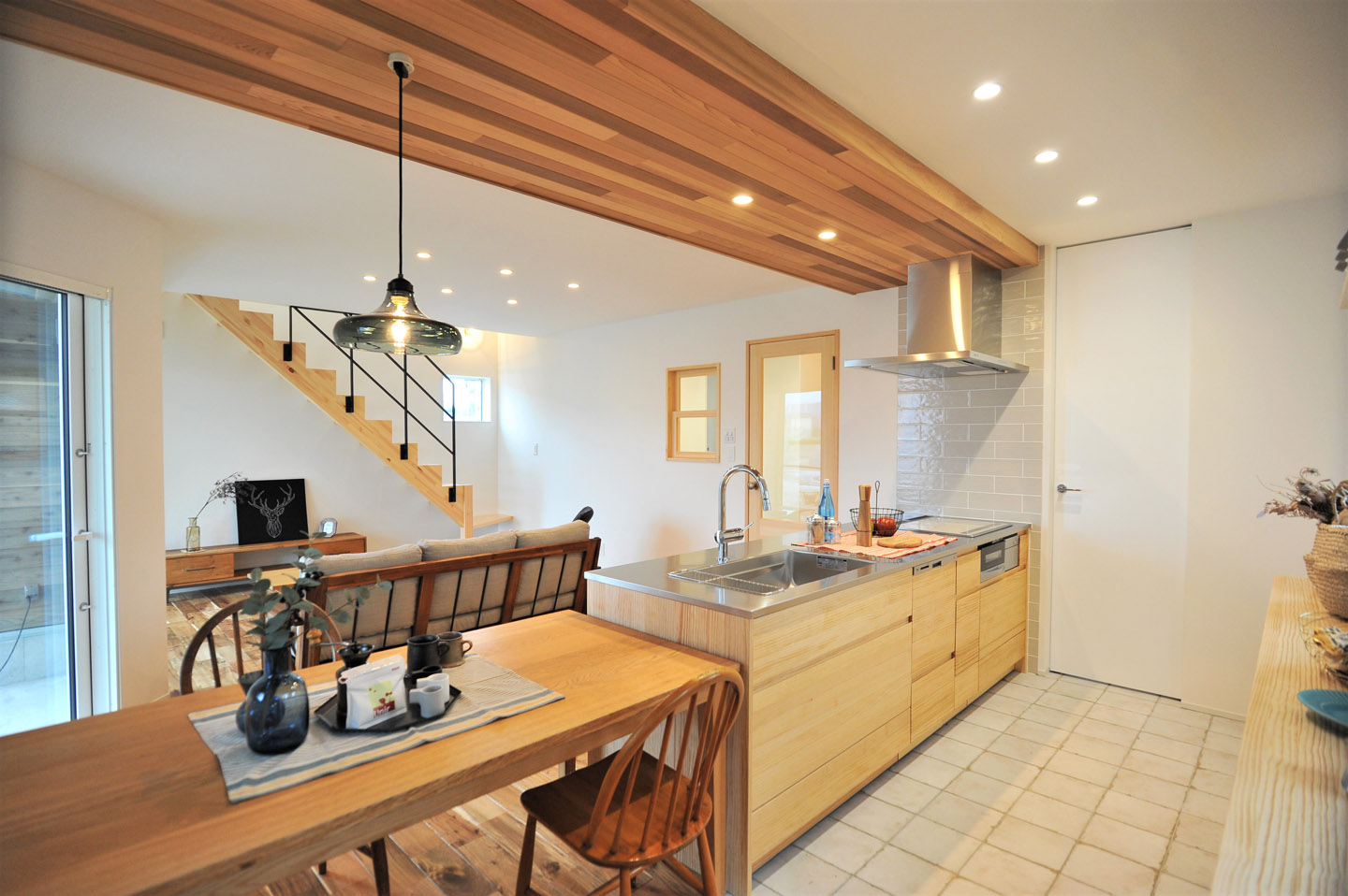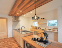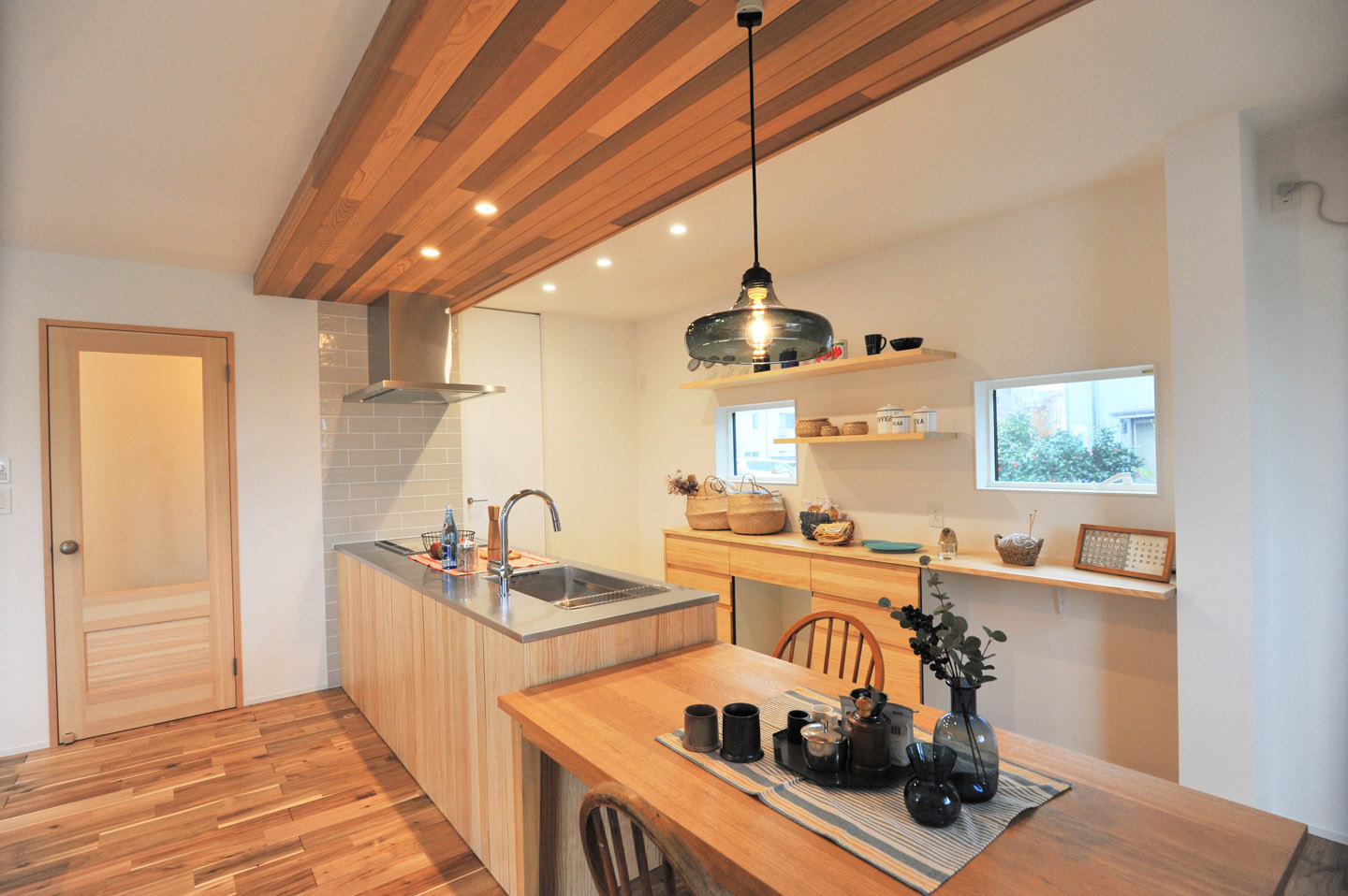 また、内装は床材のアカシア材が良い素材感で、いわゆるカントリー調にならないようなバランスを内観パースで打ち合わせを重ねながら提案させていただき、外装は杉材を採用し、外壁も軒天も自然素材ということで準防火地域のため苦労はしましたが、できあがるとやはり素晴らしい意匠となりました。