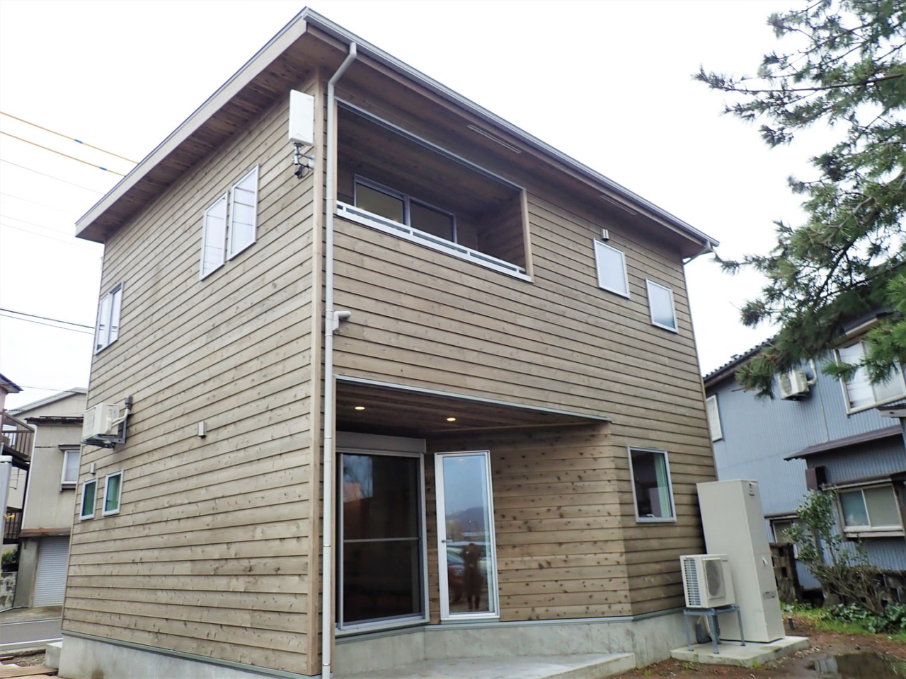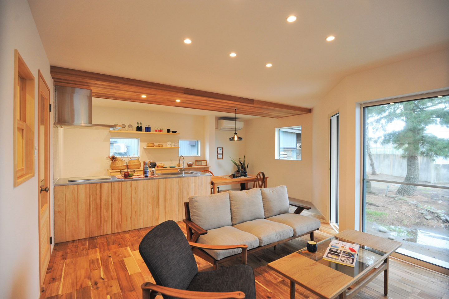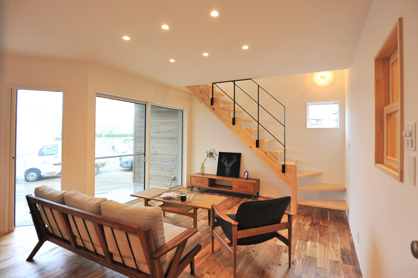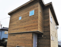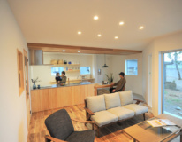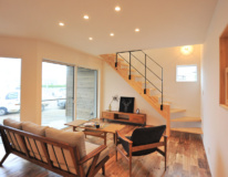 また、内装は床材のアカシア材が良い素材感で、いわゆるカントリー調にならないようなバランスを内観パースで打ち合わせを重ねながら提案させていただき、外装は杉材を採用し、外壁も軒天も自然素材ということで準防火地域のため苦労はしましたが、できあがるとやはり素晴らしい意匠となりました。