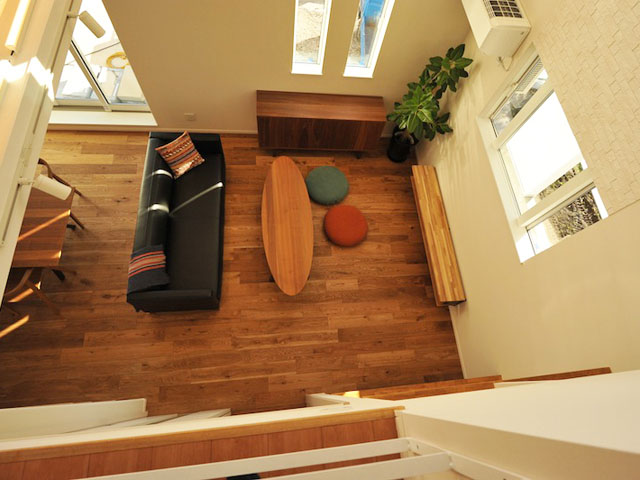 二階のサンルームから一階のリビングを眺められるので、二階にいても一階にいる家族の様子がうかがえます。