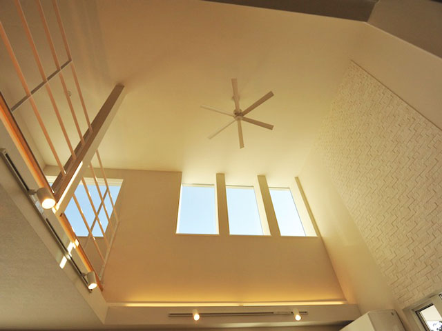 寒い時期に暖房の効率をあげるために、吹き抜け天井にはシーリングファンを取り付けています。